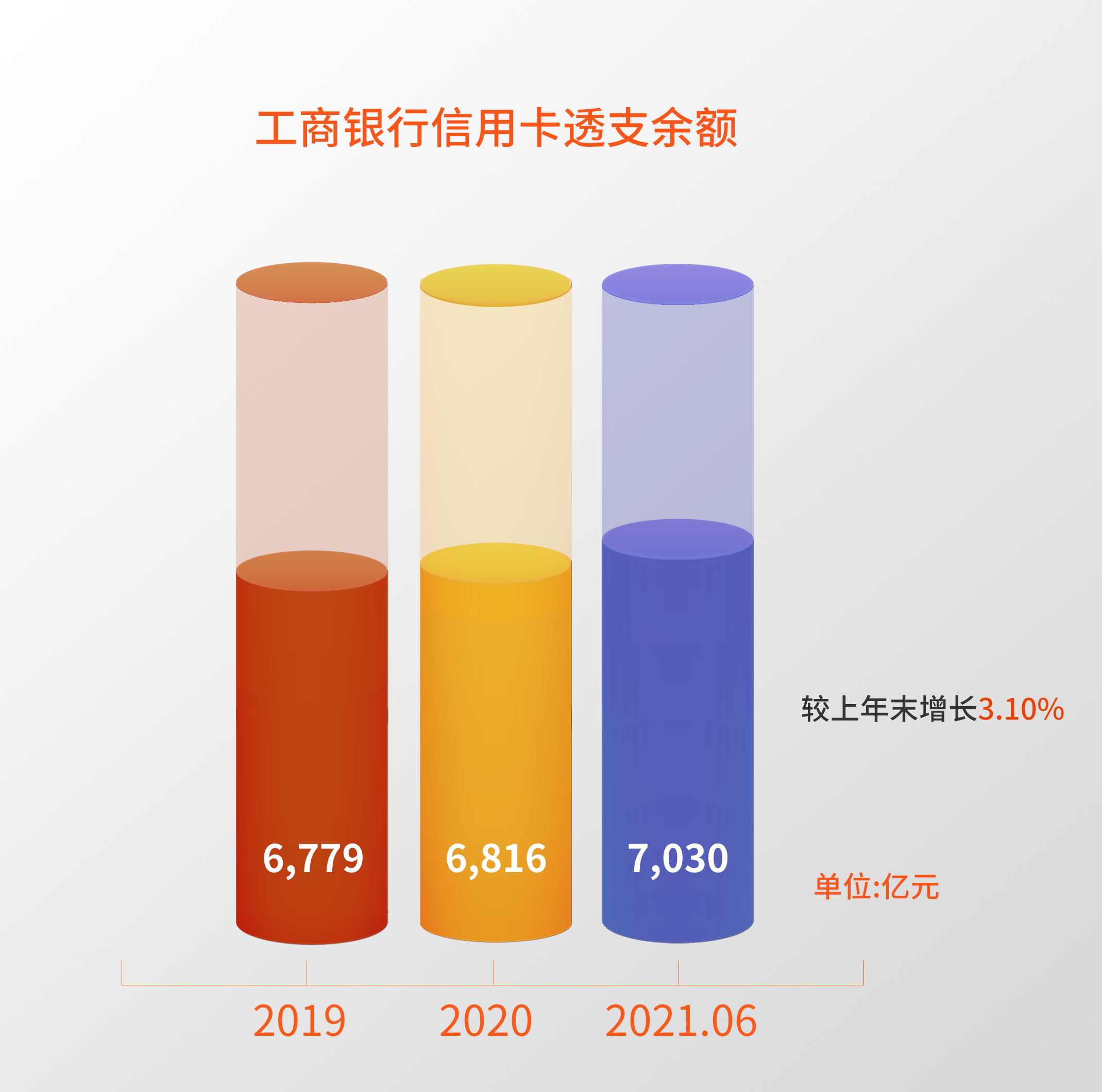 截至2021年6月末,工商银行信用卡透支余额7,029.95亿元,较上年末增长 3.1%。