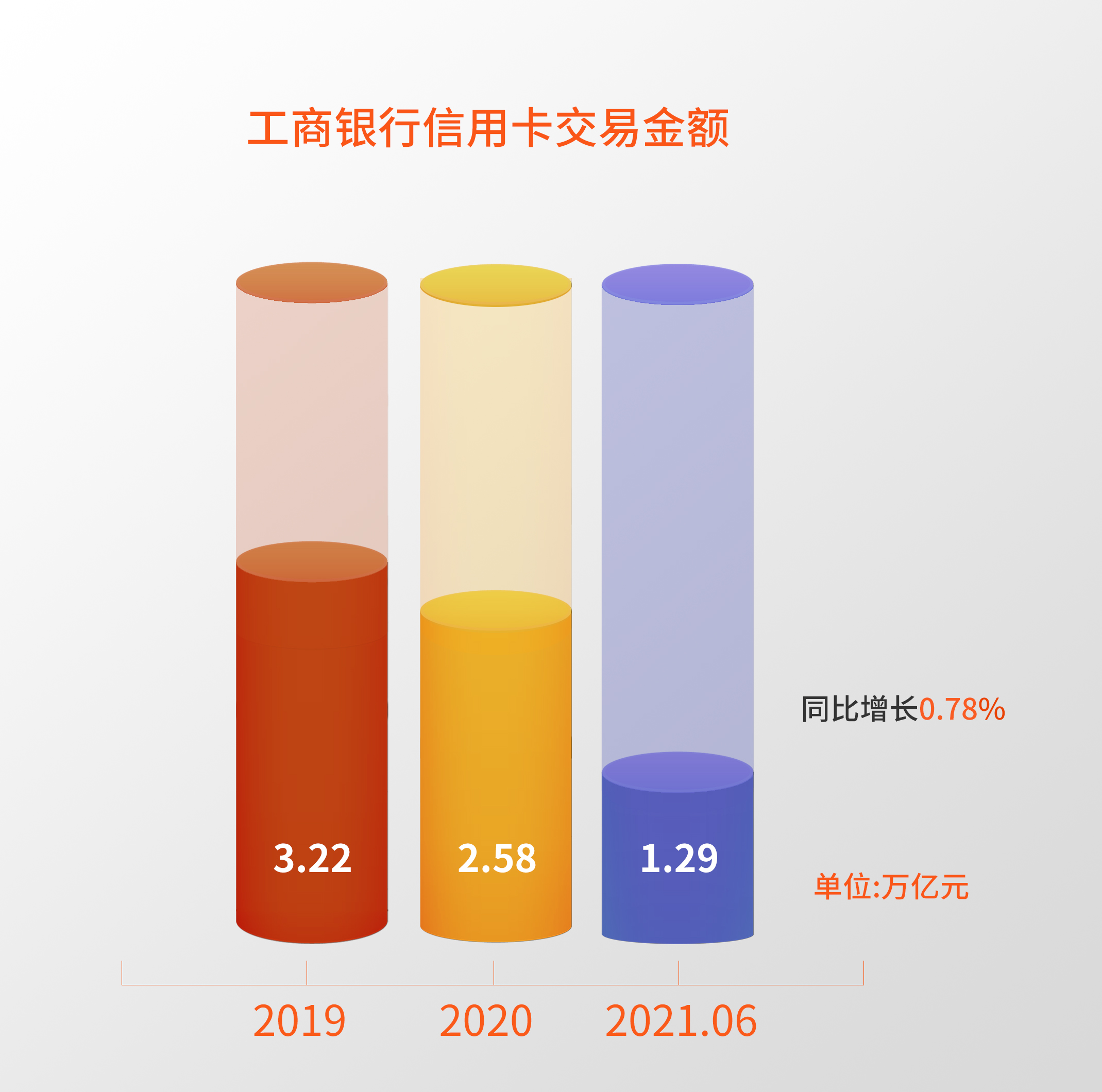 2021年上半年,工商银行信用卡总交易金额1.29万亿元,同比增长 0.78%。