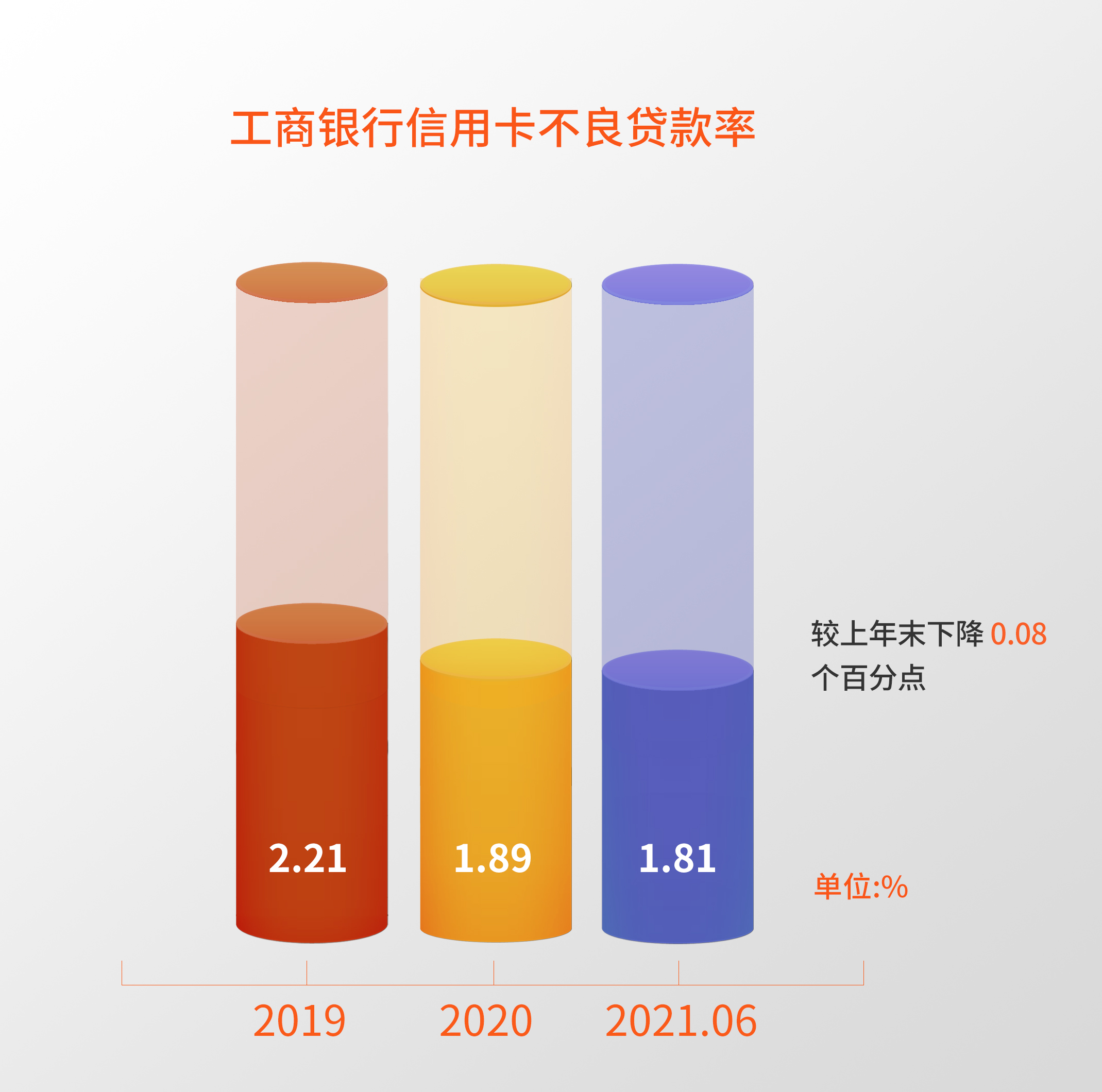 截至2021年6月末,工商银行信用卡不良贷款率1.81%,较上年末下降0.08个百分点。