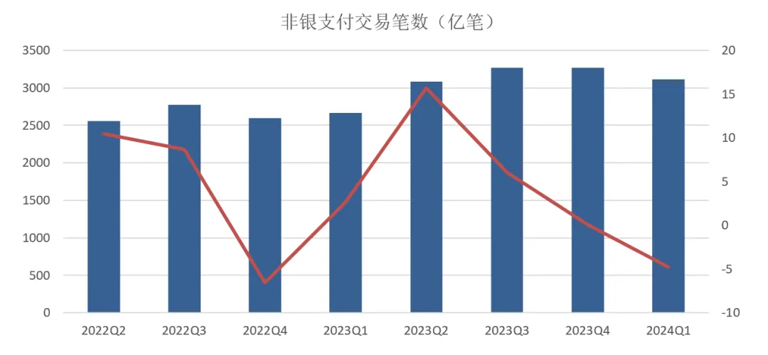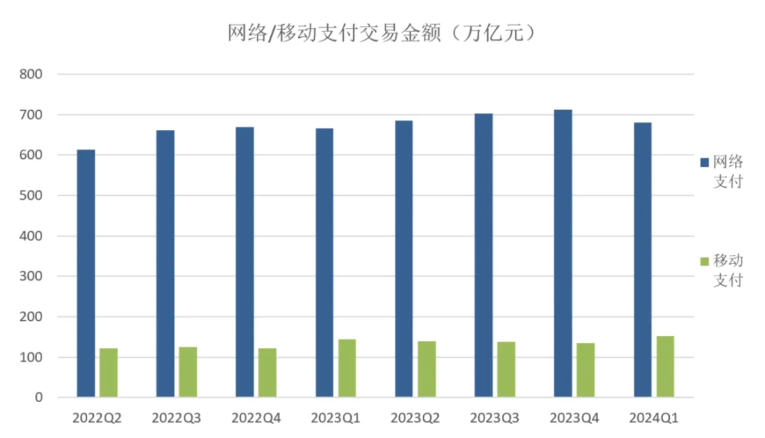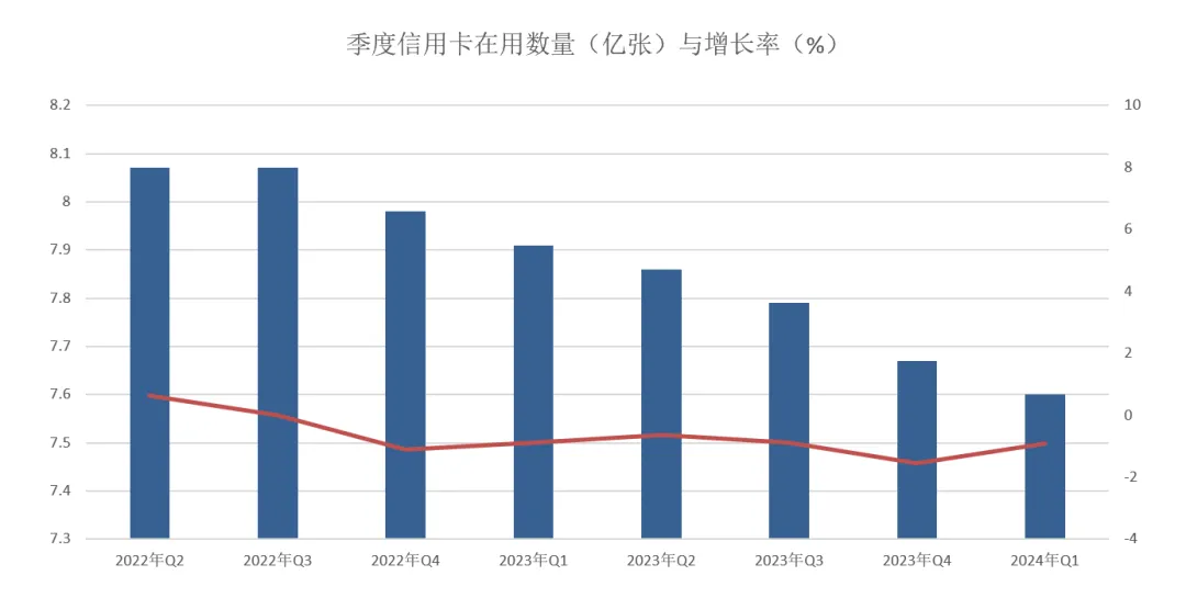 央行发布了《2024年第一季度支付体系运行总体情况》,截止到2024年第一季度末数量为7.6亿张,较2023年末的7.67亿张,环比下降0.91%。连续六个季度持续下降。信用卡授信总额为22.76万亿元,环比增长0.42%;信用卡应偿信贷余额为8.54万亿元,环比下降1.74%。信用卡卡均授信额度2.99万元,授信使用率37.51%。信用卡逾期半年未偿信贷总额1096.76亿元,环比增长11.76%,占信用卡应偿信贷余额的1.29%,首次突破千亿元大关,信用卡业务风险问题不容小觑。*信用卡逾期半年未偿信贷总额指信用卡未足额归还最低还款额,且逾期期限为181 天(含)以上的未清偿本金余额,不包含已核销金额。网络支付业务215.85 亿笔,环比下降11.94%,金额 680.11万亿元,环比下降4.39%;移动支付业务443.32 亿笔,环比下降10.24%,金额 152.07 万亿元,环比增长13.43%。非银行支付机构处理网络支付业务3114.19亿笔,环比下降4.76%;金额85.93万亿元,环比下降1.32%。*非银行支付机构处理网络支付业务量包含支付机构发起的涉及银行账户的网络支付业务量,以及支付账户的网络支付业务量。自 2023 年 1 月起,人民银行修订后的《非银行支付机构支付业务数据统计口径(试行)》正式实施,将转账业务统一纳入统计,并对支付机构间合作业务去重。