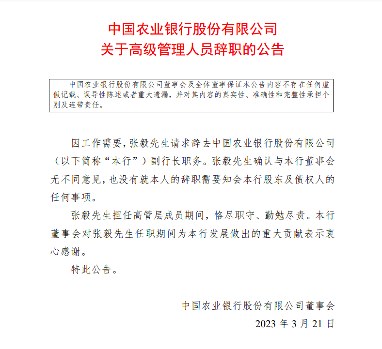 3月21日晚间,农业银行公告称,因工作需要,张毅请求辞去该行副行长职务。