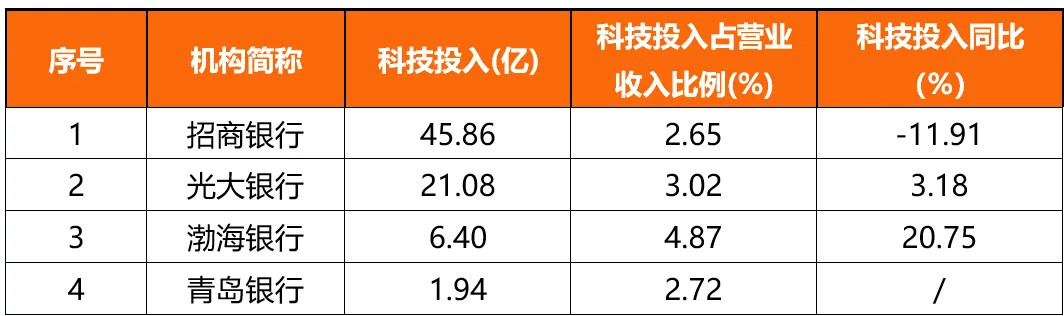 兴业银行、南京银行减少披露科技投入相关数据;贵阳银行减少披露科技投入金额数据;邮储银行、交通银行、张家港行、平安银行自2022年起便不再披露科技投入相关数据。