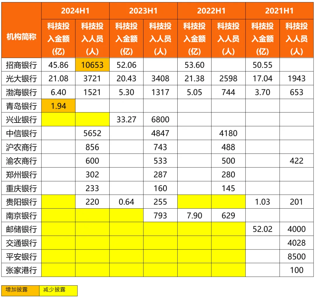 增减情况上,2024年上半年,招商银行增加披露了科技员工数据;青岛银行增加披露了科技投入金额数据。