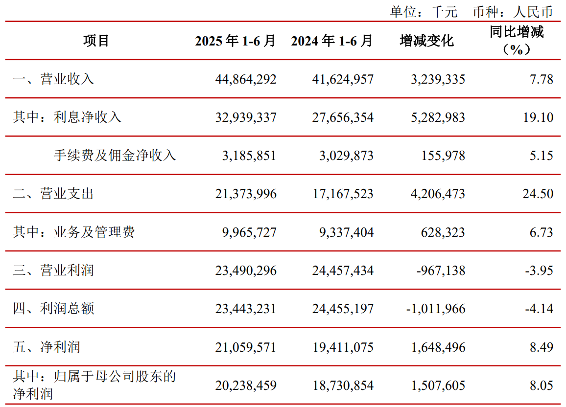 报告期内,实现营业收入448.64亿元,同比增长 7.78%,归属于上市公司股东的净利润202.38 亿元,同比增长 8.05%;其中利息净收入 329.39 亿元,同比增长19.10%;手续费及佣金净收入 31.86 亿元,同比增长 5.15%;ROA(年化)为 0.96%,ROE(年化)为15.64%,净息差、净利差均为1.78%。
