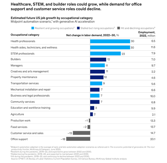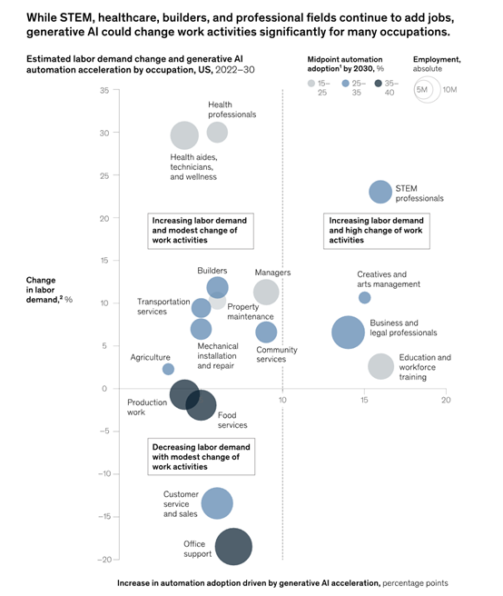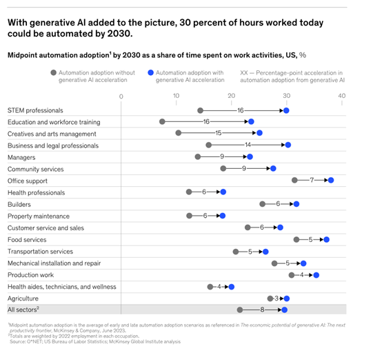 由于生成式AI的出现加速了企业对自动化的应用进程,麦肯锡估计,到2030年,自动化会接管美国30%的经济工作时间。
